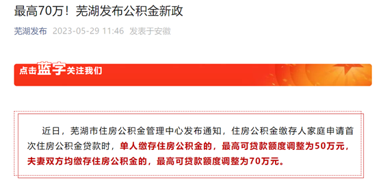 5月29日,安徽芜湖发布住房公积金新政,包括最高可贷款额度提高至70万元;首次公积金贷款结清的,次月可申请改善性住房公积金贷款;首次公积金贷款购自住新房的,可提取账户余额支付首付款;多子女家庭住房公积金贷款额度可上浮,与高层次人才支持政策可叠加使用等。