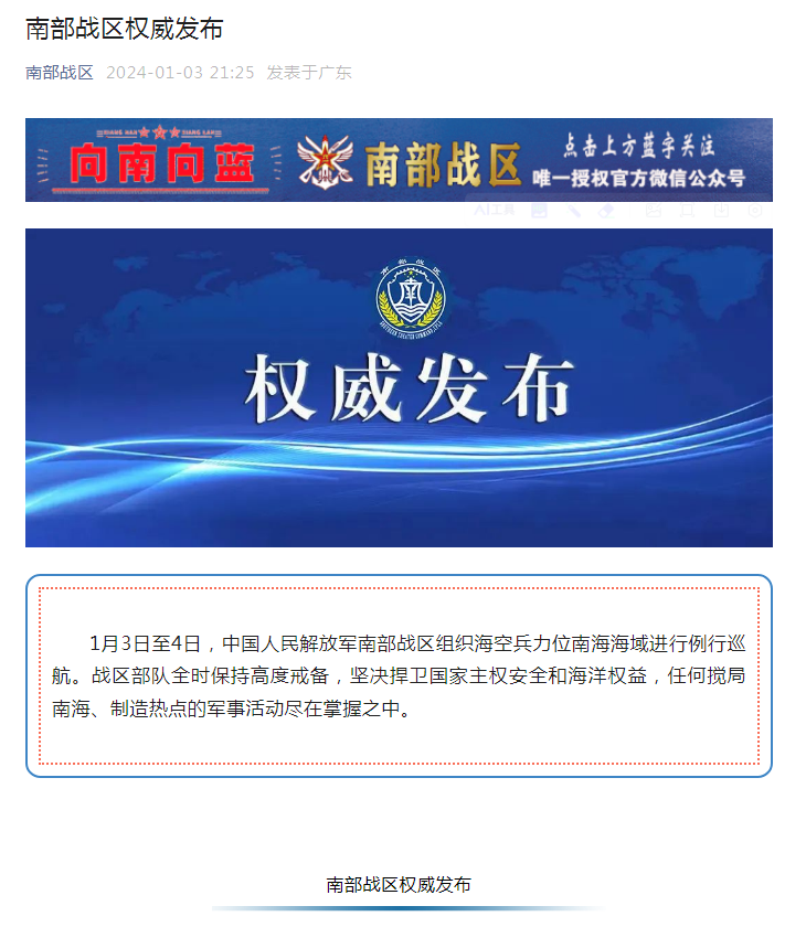 1月3日至4日,中国人民解放军南部战区组织海空兵力位南海海域进行例行巡航。战区部队全时保持高度戒备,坚决捍卫国家主权安全和海洋权益,任何搅局南海、制造热点的军事活动尽在掌握之中。