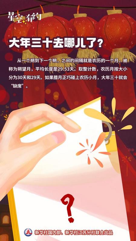 王科超介绍,从一个朔到下一个朔,之间的间隔就是农历的一个月,被称为朔望月,平均长度是29.53天。实际上,朔望月的长度并不是固定的,为29天多。本世纪内最短29.27天,最长29.82天。取整计数,农历月分为大月和小月,前者30天,后者29天。如果腊月正巧碰上农历小月,大年三十就会“缺席”。