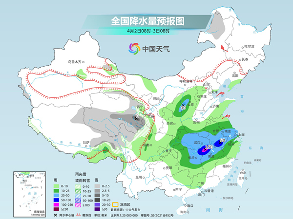 具体来看,中央气象台预计,今天,内蒙古东北部、西藏东部、甘肃河西、青海中南部、川西高原北部等地部分地区有小雪或雨夹雪,其中,西藏东南部、青海东南部、甘肃西南部等地部分地区有中到大雪(5~8毫米)。陕西东部、山西西部、黄淮南部、江淮大部、江汉、江南北部、四川盆地东部、重庆东北部等地部分地区有中到大雨,其中,湖北东南部、湖南东北部、安徽东南部、江西东北部等地部分地区有暴雨,局地大暴雨(100~150毫米)。