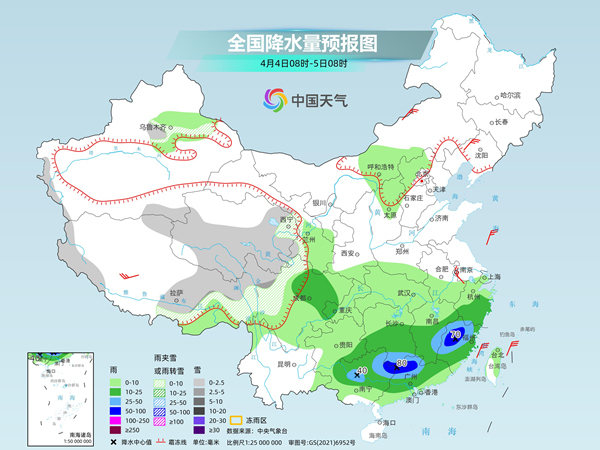 后天,新疆沿天山地区、西藏南部和东部、青海中南部、甘肃河西、川西高原北部等地部分地区有小到中雪或雨夹雪。四川盆地大部、重庆西南部、贵州东南部、江南中南部、华南中北部等地部分地区有中到大雨,其中,福建西北部、广西东北部、广东西北部等地部分地区有暴雨(50~80毫米)。