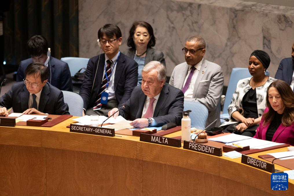 4月14日,在位于纽约的联合国总部,联合国秘书长古特雷斯(前中)在安理会就伊朗袭击以色列举行的紧急会议上讲话。新华社记者 谢锷 摄