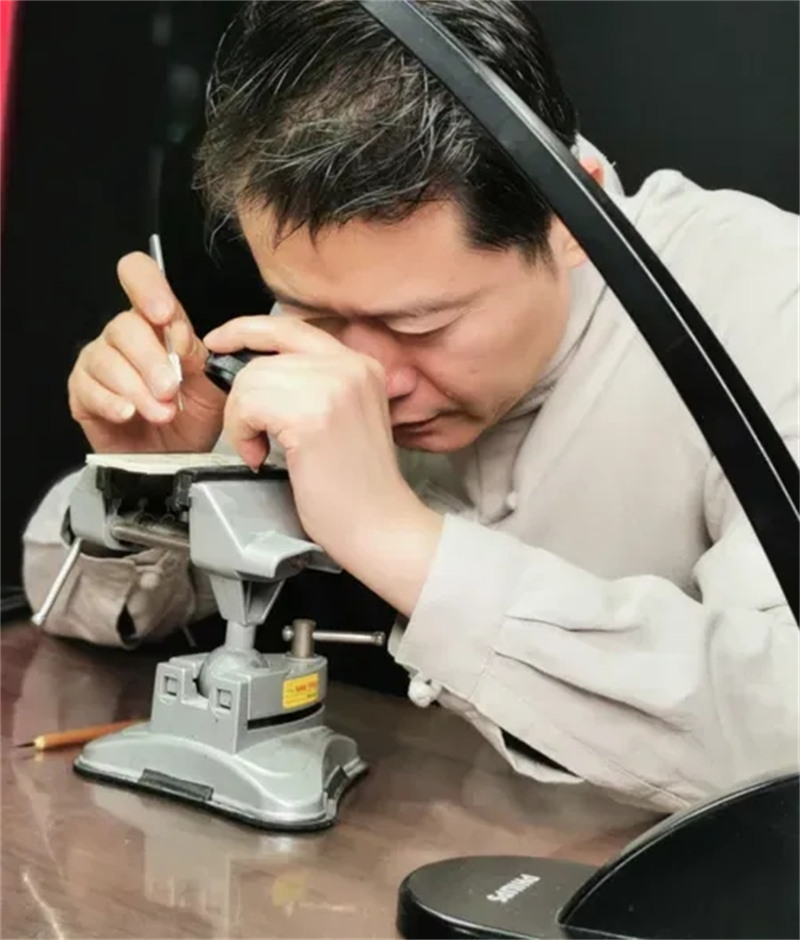 郑士儒进行牙雕细部的雕刻工作。图片来源:文明北京微信公号
