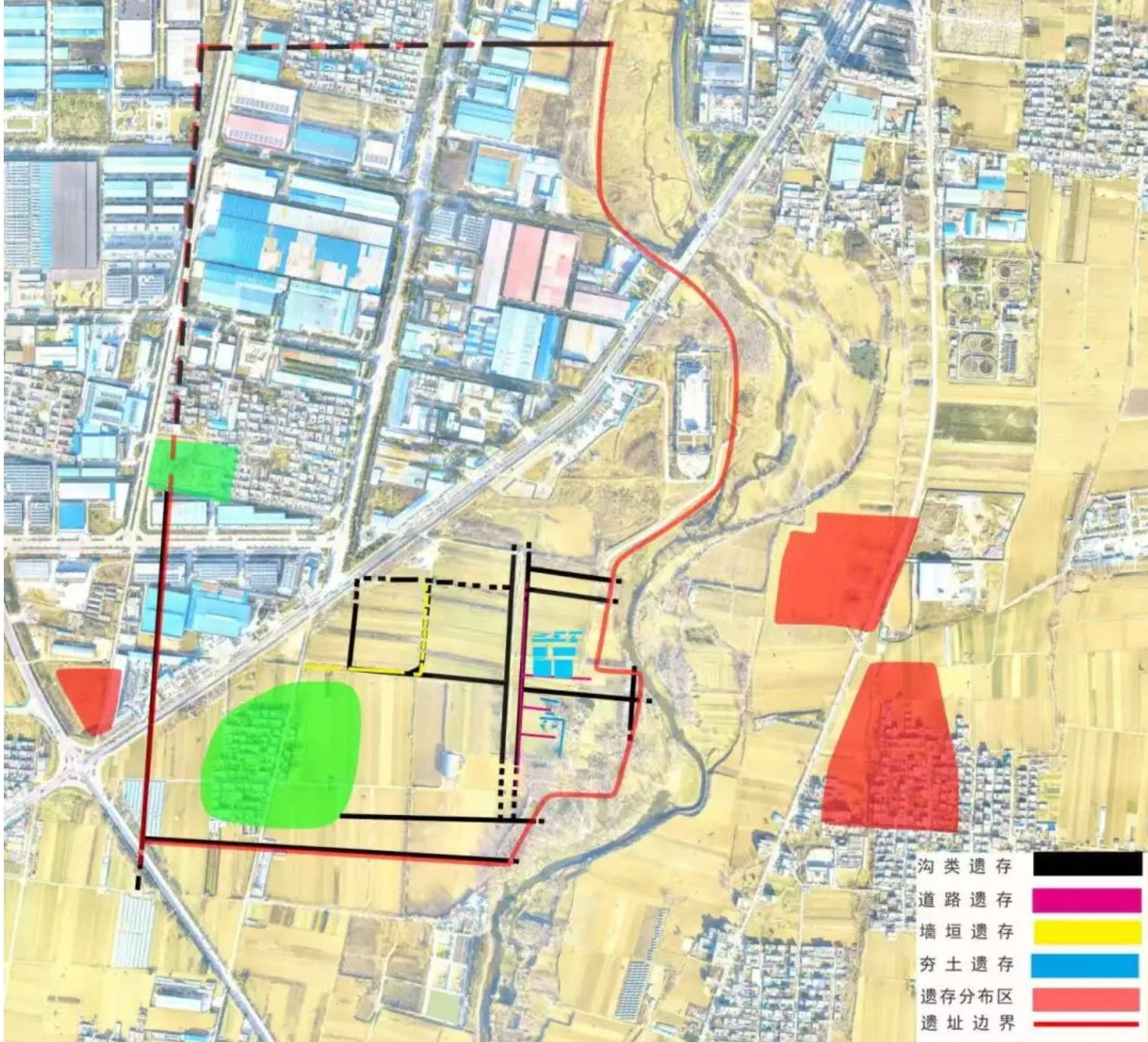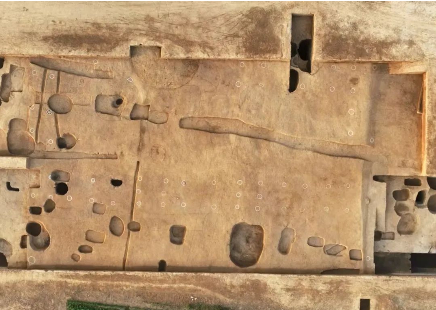 遗址内探明沟类遗存11处,宽8—12米,深2.5—3.7米,两侧5—8米的范围内多为空白区。这些沟类遗存纵横交错,规划有序,将南部区域分为相对完整的5个区块,呈现出与二里头遗址相似的“多网格”布局。