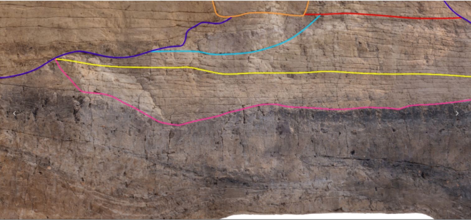 此外,还发现4条道路,其中一条已探明长度320米。部分区域保留有明确车辙痕迹,初步推断共有7组车辙,间距约85厘米,与二里头遗址的88—92厘米的车辙间距相差不大,车辙印痕深4—7厘米。