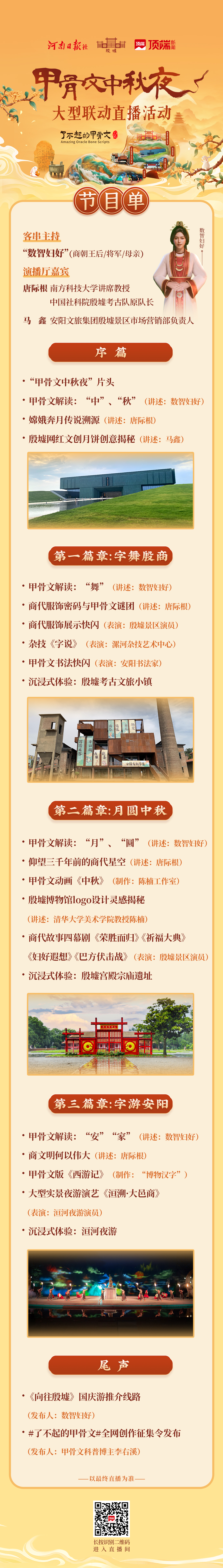 “甲骨文中秋夜”是首个甲骨文主题的大型中秋联动直播,将通过大咖讲述、游客互动、中秋演艺等多种形式,为观众呈现一场视觉与文化的双重盛宴。
