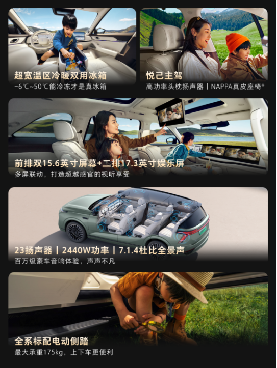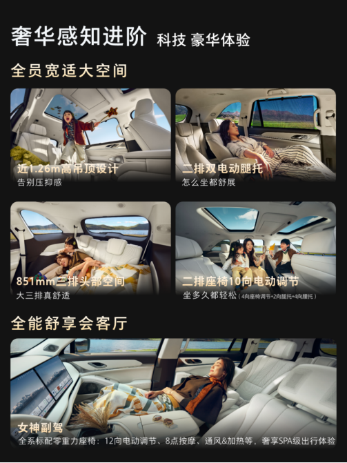在空间布局上,蓝山智能进阶版坚持舒适平权,从主驾的八点按摩、副驾的一键零重力模式,到二排带腿托的“头等舱”座椅与一键拓展的奢侈空间,再到确保成人可坐可躺的实用第三排,每个座位都承载着对家人的尊重与关怀。配合-6℃-50℃的7L豪华⼤冰箱,将实用关怀融入每一处设计,让豪华成为全家共享的日常体验。