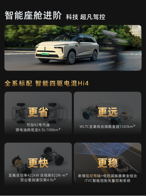 Hi4性能版,是全球首创的四挡全速域直驱技术。在路上的表现可概括为:跑得省、跑得远、跑得快、跑得稳。在4.9秒零百加速性能的同时,还能达成6.5L/100km的超低馈电油耗,更能带来1343km综合续航。并通过前后50:50轴荷分配与iTVC智能扭矩控制,为全家出行提供了从容安稳的驾乘体验。