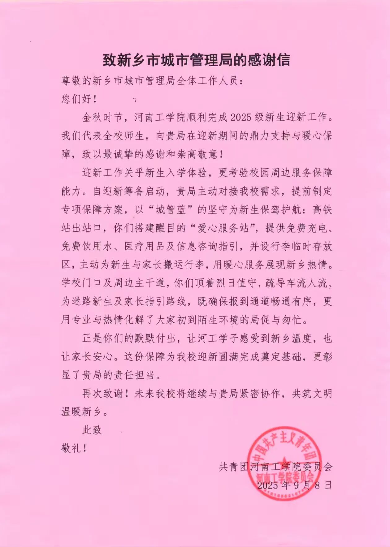 9月26日,河南科技学院、新乡学院、河南工学院、新乡职业技术学院将印有“迎新护航显担当、情系高校暖人心”等字样的4面锦旗专程送至新乡市城市管理局党组成员、城市管理保障中心党委书记、主任常慧的手中。各高校领导动情的说:“在一年中最繁忙、最重要的迎新时刻,城管同志们用辛勤的汗水,换来了校园周边的井然秩序和师生家长的交口称赞,你们是当之无愧的‘迎新护航员’!”
