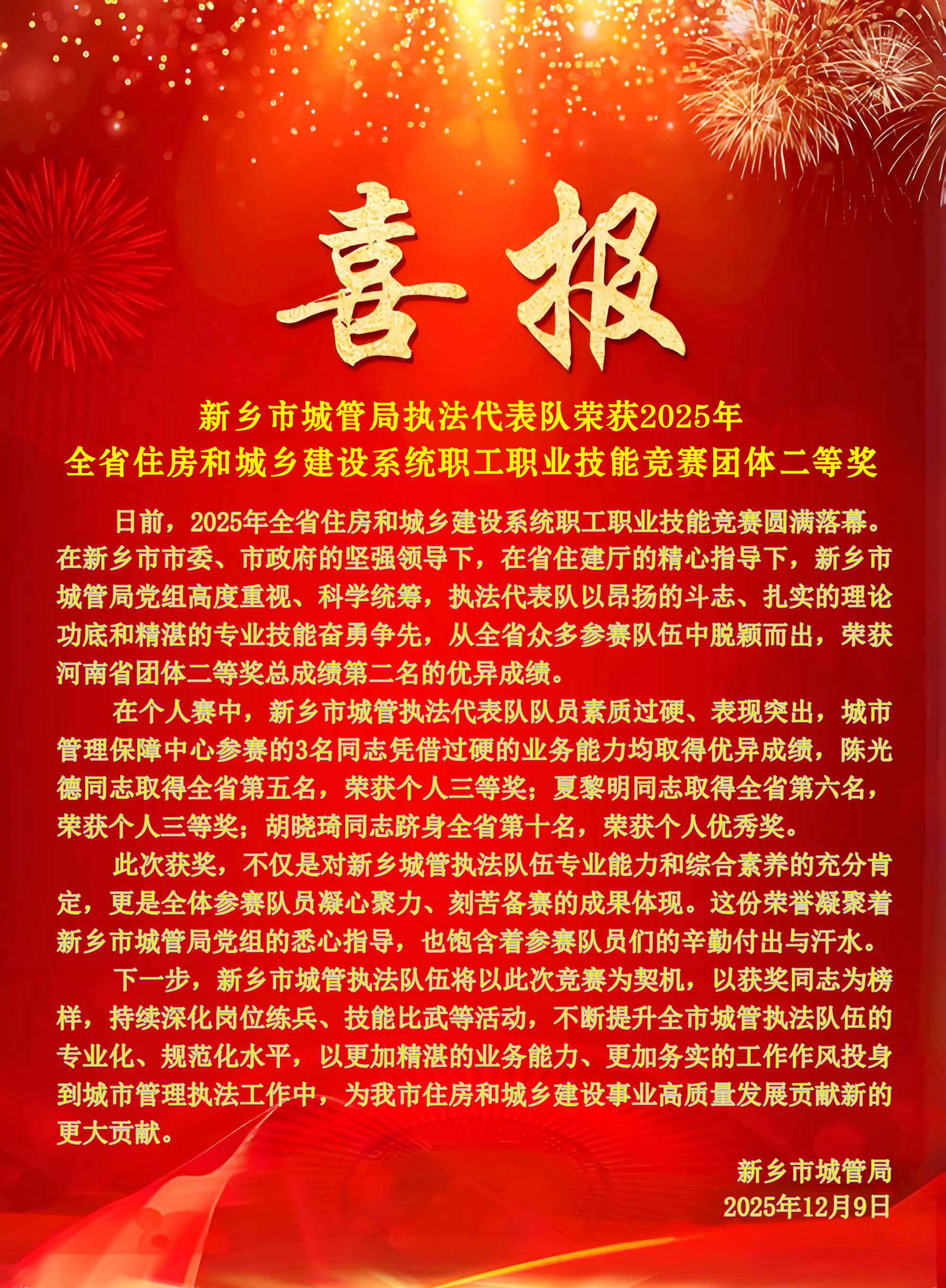 日前,2025年全省住房和城乡建设系统职工职业技能竞赛圆满落幕。在新乡市市委、市政府的坚强领导下,在省住建厅的精心指导下,新乡市城管局党组高度重视、科学统筹,执法代表队以昂扬的斗志、扎实的理论功底和精湛的专业技能奋勇争先,从全省众多参赛队伍中脱颖而出,荣获河南省团体二等奖总成绩第二名的优异成绩。