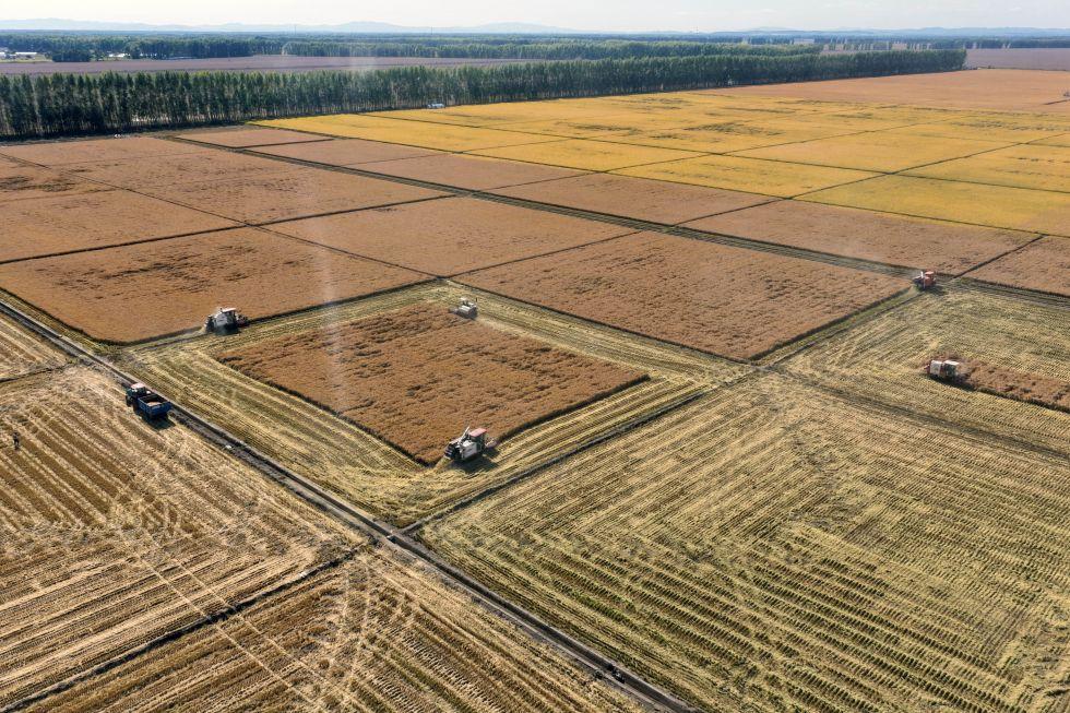 2025年9月23日,在黑龙江北大荒农业股份有限公司友谊分公司一水田地块,大型农业机械在进行水稻收获作业(无人机照片)。 新华社记者 王松 摄