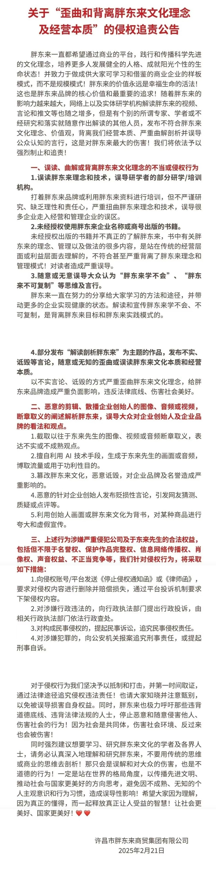 胖东来明确了两类侵权行为:一是,误读、曲解或背离胖东来文化不当或侵权行为。二是,恶意剪辑、散播企业创始人的图像、音频或视频,断章取义地阐述解析胖东来,误导大众对企业创始人及企业品牌的看法和观点。