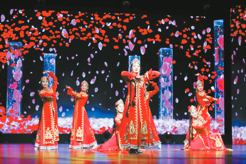 大型歌舞《美丽新疆》由新乡市群众艺术馆和伊吾县文化体育广播电视和旅游局共同打造,全方位展现新疆的美丽与富饶。演出最后,全场合唱《我和我的祖国》,用嘹亮的歌声表达对祖国的热爱与祝福,天山与太行的情谊在歌声里凝聚,将现场气氛推向高潮。