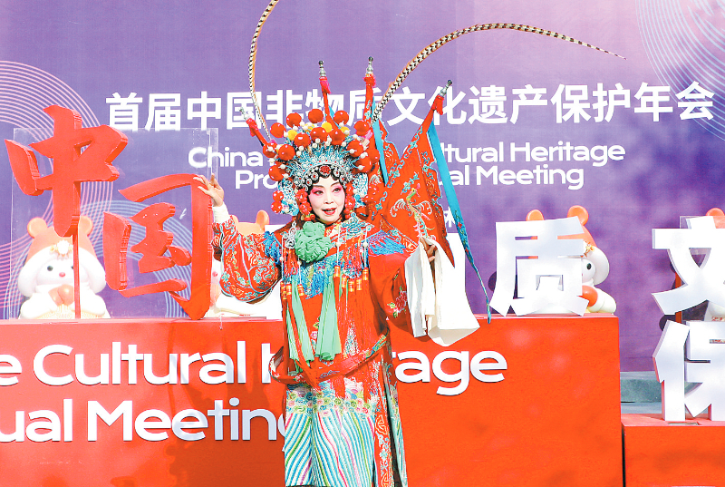 图为2023年2月17日,关小凤在首届中国非物质文化遗产保护年会上演出《三上关》。