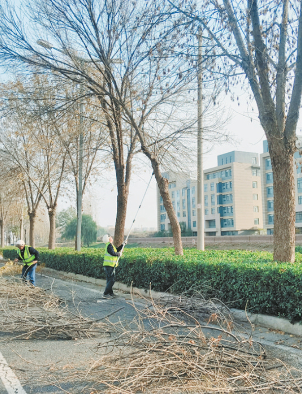 修剪整形造新貌。初冬时节,树木进入休眠期,树体代谢缓慢、养分消耗少,为充分发挥冬剪“减耗、防虫、塑形、避险”的多重优势,该局科学部署,开展树木冬季修剪工作。通过修剪,一是去除病患树枝,剪除病虫枝、枯死枝,减少病虫害孳生源头;二是优化“身形”,调整树形结构,改善通风透光条件,让树木生长更旺盛;三是预防风险,及时清理过密、过弱枝条,降低断枝风险,保障群众出行安全。