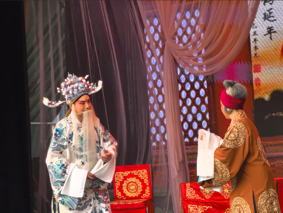 幕布拉开的瞬间,台下的嘈杂声突然静了下去。当“穆桂英”身着帅服亮相,一句“辕门外三声炮如同雷震……”刚出口,王福庆大爷就忍不住跟着轻唱,手指在膝盖上稳稳打着板眼。前排的8岁小姑娘汤圆被舞台上的红装吸引,拉着奶奶的衣角小声问:“奶,她穿的盔甲是真的吗?她的衣服看着好威风啊!”奶奶还没回答,汤圆就被“穆桂英”舞枪的利落动作惊得睁大眼睛,小手不自觉地拍起了巴掌。