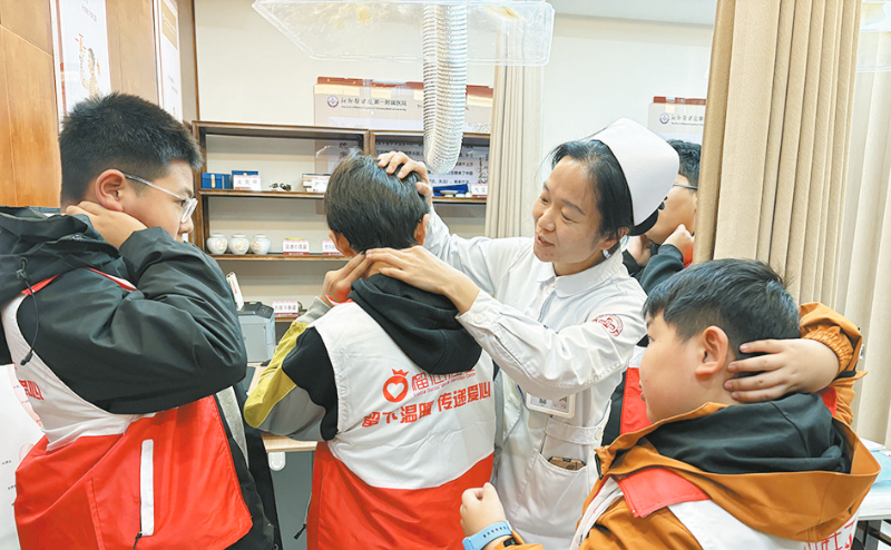 活动现场,24名10岁至16岁的青少年分成4个闯关小队,领取任务卡分别到骨科、营养科、临床技能培训中心、国医堂开展医院科室探索之旅。在骨科诊室,医生结合新就业群体长时间骑行、搬运重物的工作特点,详细讲解骨骼肌肉损伤风险,孩子们认真记录拉伸要领,立志成为父母健康的“小提醒官”;营养科内,“十分钟快速营养餐”搭配秘籍与健康零食推荐干货满满,孩子们分工合作,精心设计出适合外卖员父母的便携午餐盒方案;临床技能培训中心的实操教学更是让孩子们受益匪浅,从擦伤处理到中暑急救,每一项自救互救技能都成为守护“马路天使”的重要本领;国医堂的体验环节温馨十足,孩子们跟着中医学习对身体有益的穴位位置及按摩手法,盼着回家用“神奇小手”为父母缓解疲劳。“以后我要每天提醒爸爸骑行后拉伸”“我设计的午餐盒要让妈妈吃得营养又方便”“学会急救,以后能保护爸爸妈妈了”,活动最后,孩子们热烈地分享着自己的体会,一句句真挚的话语,道出了对父母的关爱与守护决心。活动期间,孩子们还参观了河南医药大学第一附属医院院史馆,该院还向孩子们赠送了健身弹力带和急救医疗包等物品。