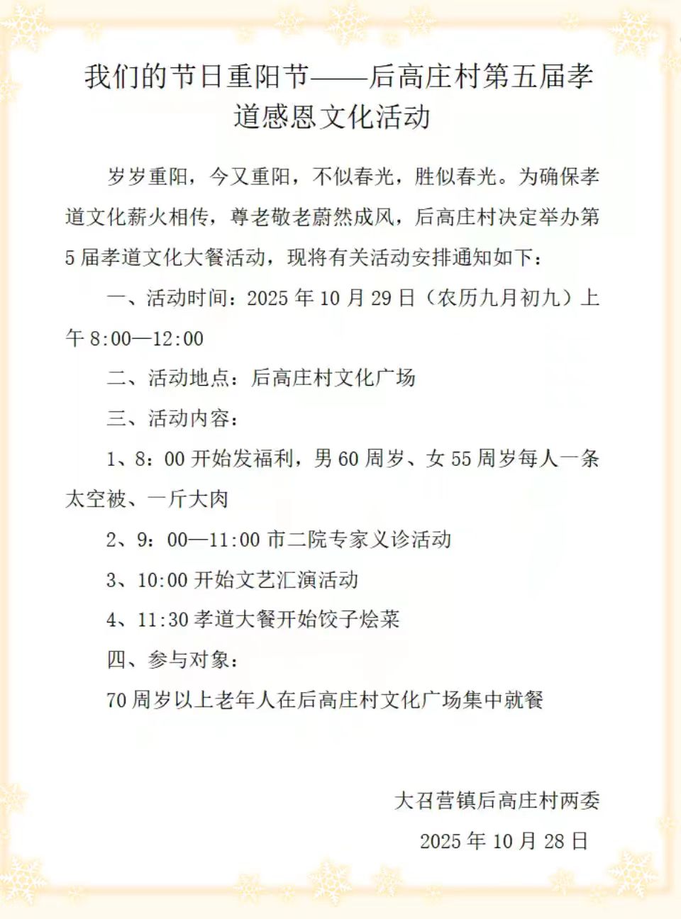 金秋送爽,丹桂飘香。在重阳佳节来临之际,为深入贯彻落实习近平总书记关于“弘扬中华民族孝亲敬老传统美德”的重要指示精神,推动社会主义核心价值观在基层落地生根,后高庄村于2025年10月29日(农历九月初九)在村文化广场隆重举办第五届孝道感恩文化活动。