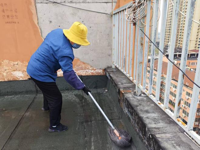 对于居民楼屋顶,清洁人员手持清洁工具,对屋顶进行拖洗确保无大量积尘残留,有效维护屋顶的整洁与安全,也为建筑的长效使用提供了保障。通过定期对不同区域进行精细化清洁,不仅能有效减少扬尘污染、改善社区微环境,更能增强居民的环保意识,引导大家共同参与到社区环境的维护中来。