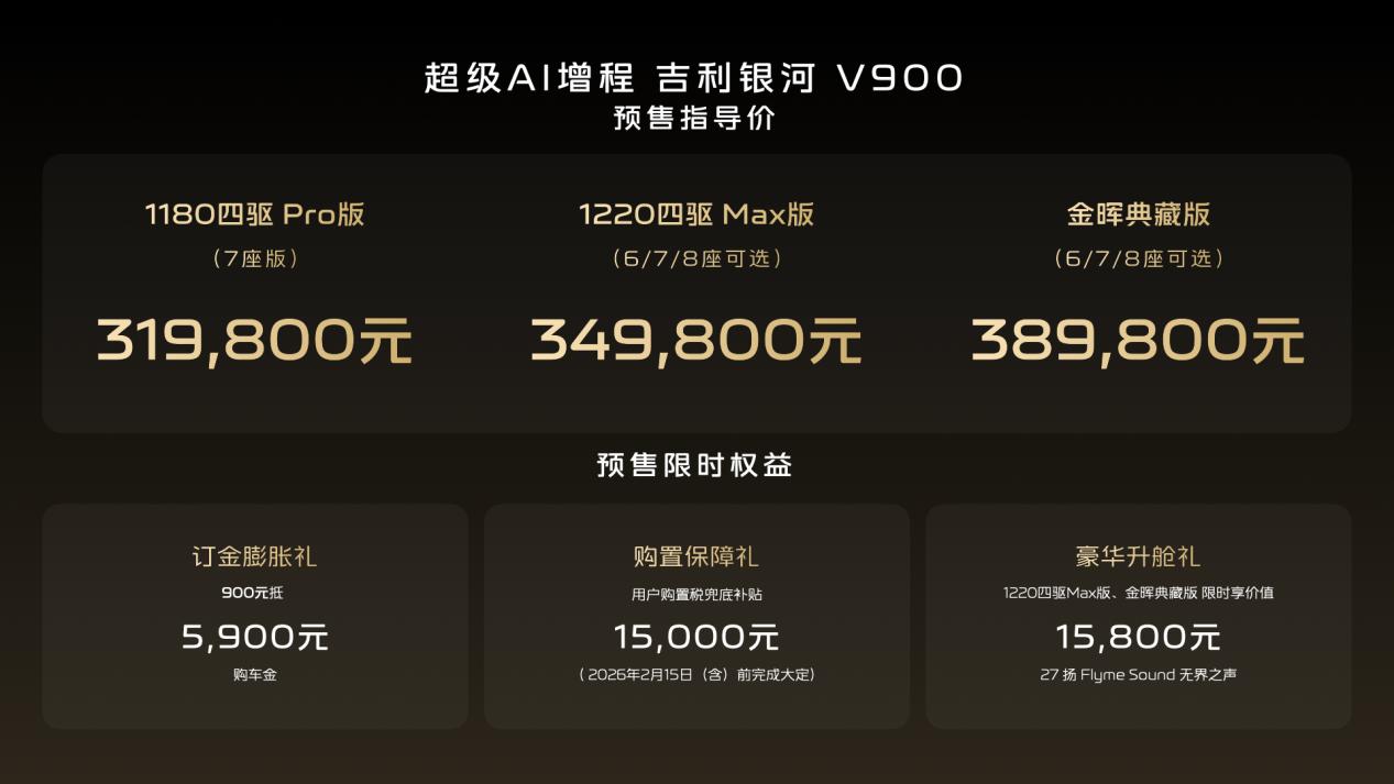 此外,从即日起,用户可通过吉利银河APP、微信小程序、抖音小程序及官网等官方渠道下订,下订即享900元抵5900元的“订金膨胀礼”、购置税补贴15000元的“购置保障礼”,其中四驱Max版、金晖典藏版还可限时享价值15800元的27扬Flyme Sound无界之声“豪华升舱礼”,超高价值,诚意十足。