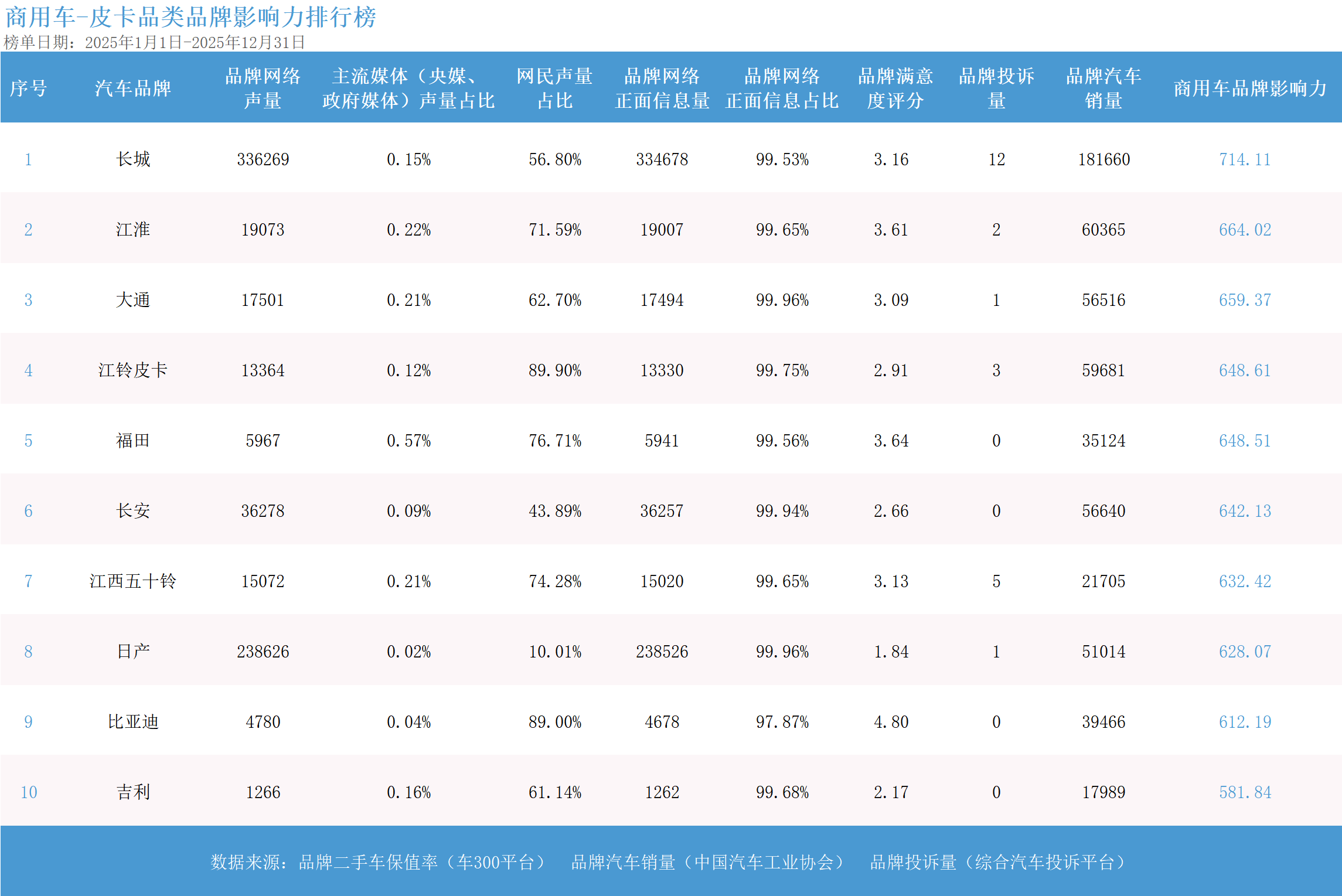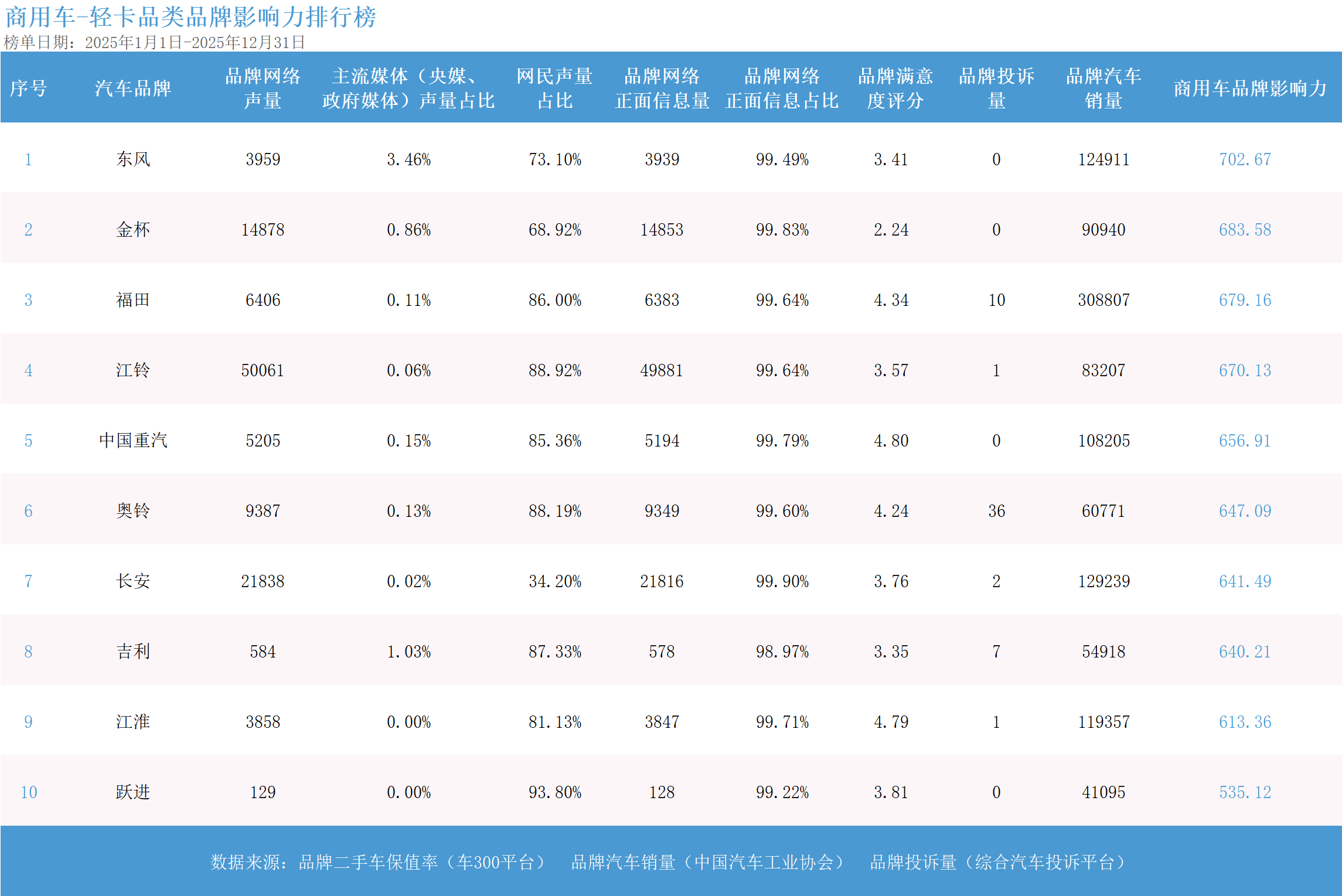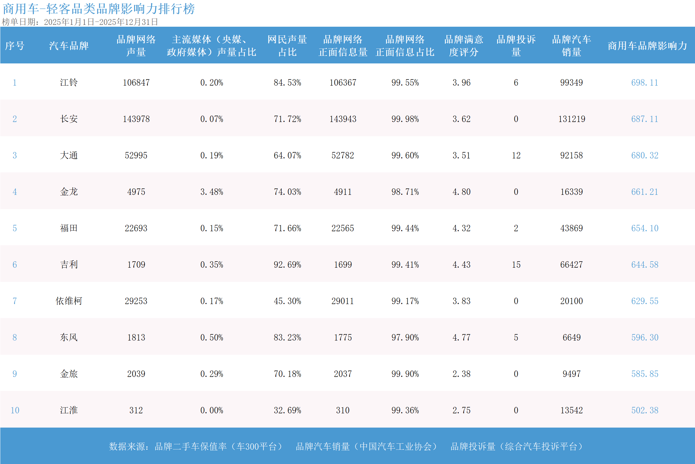 而在轻客市场,江铃汽车以698.11分领跑,99.55%的正面信息占比与接近10万辆的年度销量,生动诠释了其出众的商业价值;长安凯程则以超过13万辆的销量规模紧随其后,并在新能源轻客车型上实现了快速增长,展现出强大的市场适应力。