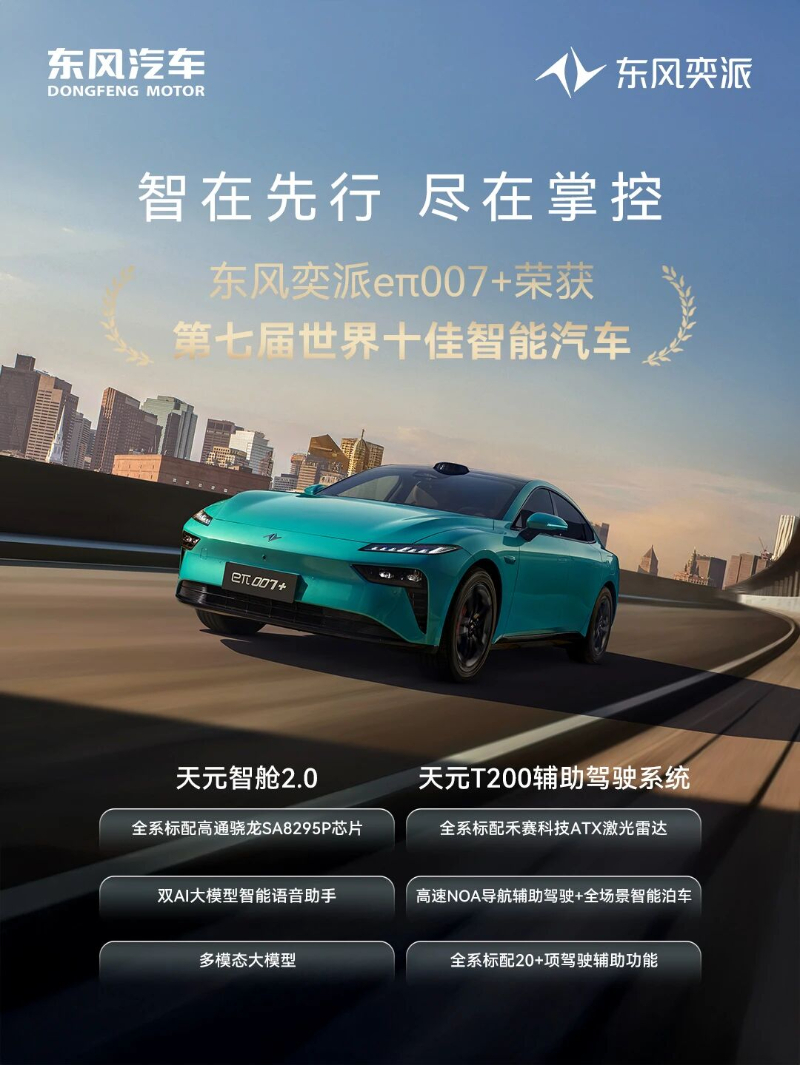 东风奕派eπ007+、纳米06分别荣获“世界十佳智能汽车”“世界十佳汽车智能座舱”奖项