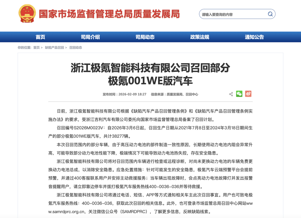自2026年3月6日起,召回生产日期从2021年7月8日至2024年3月18日期间生产的部分极氪001WE版汽车,共计38277辆。