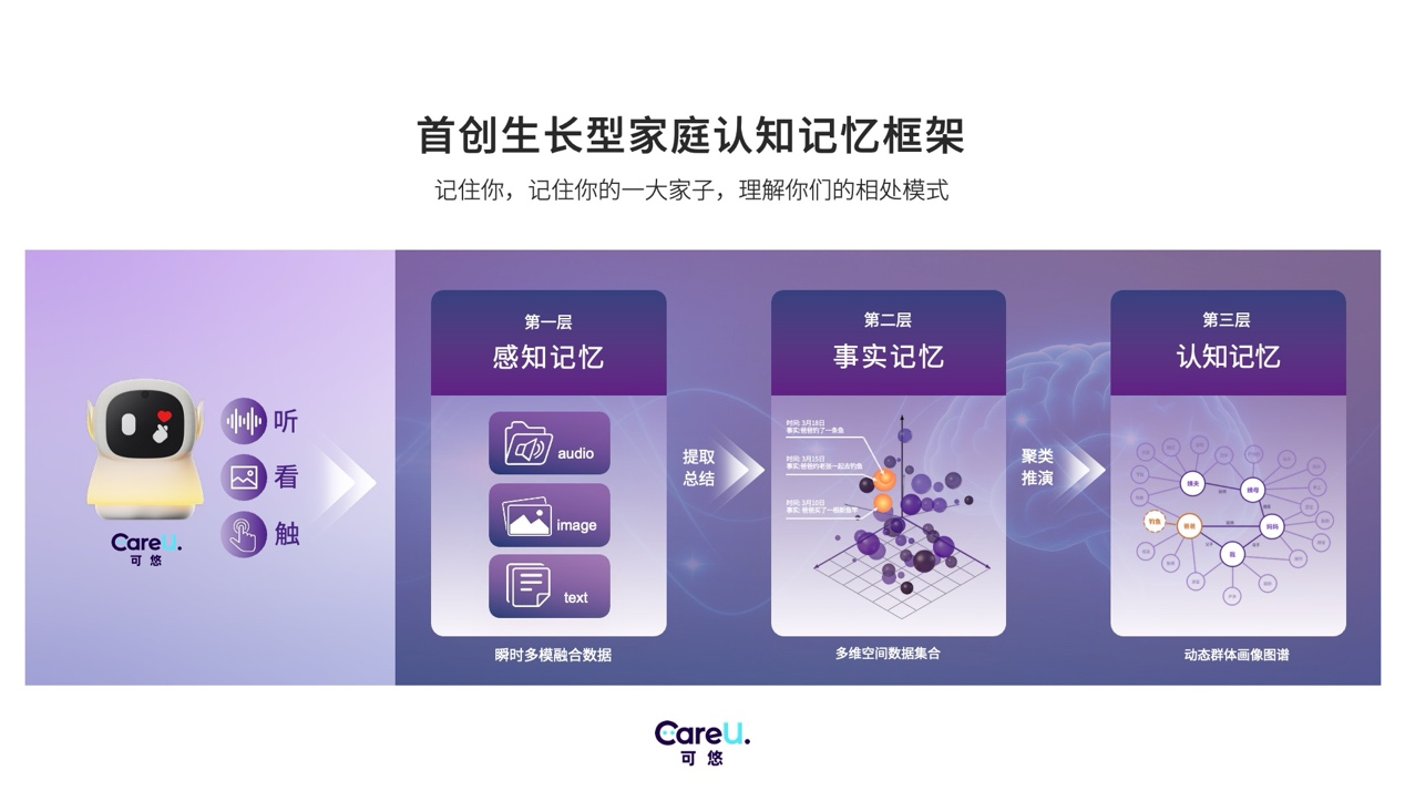 这套体系构建了生长型记忆逻辑。第一是感知记忆,可悠在日常陪伴中捕捉家庭里的每一段对话、每一个生活瞬间,将鲜活日常沉淀为专属原始记忆,融合形成多维感知记忆,完整读懂家庭场景全貌。