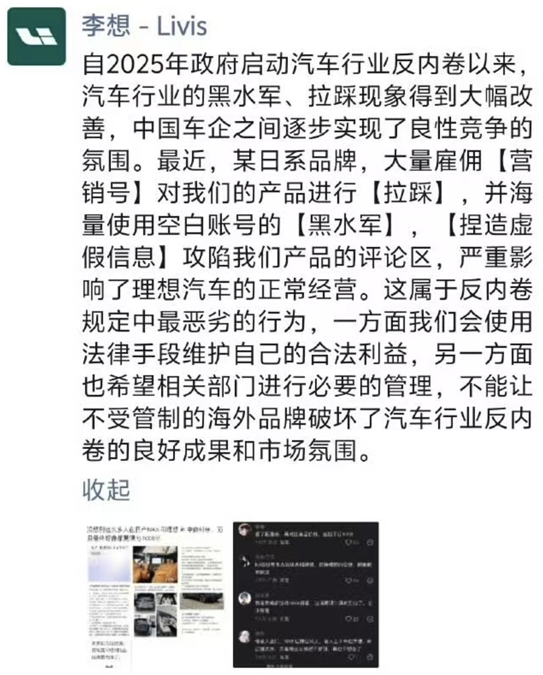同日,理想汽车创始人、董事长兼CEO李想在朋友圈表示,某日系品牌大量雇佣营销号进行产品拉踩,并使用空白账号实施水军营销,捏造不实信息冲击产品评论区,对企业正常经营秩序造成不良影响。