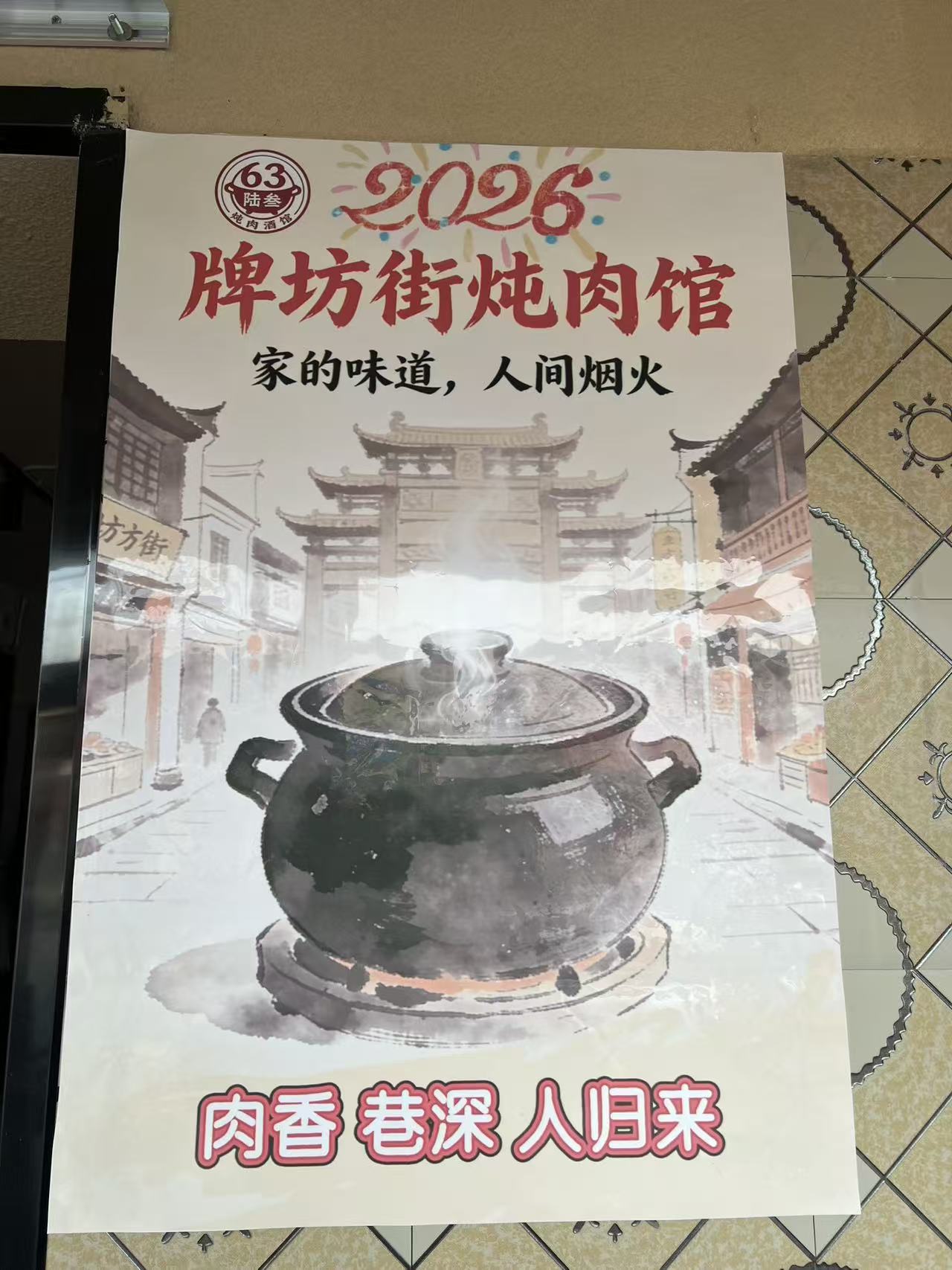 打那以后,陆叁炖肉馆成了老街的“暖心据点”,有人带着朋友来,就为讲一讲logo里的小故事;有人专门奔着那口炖肉汤来,喝上一碗,从胃里暖到脚底板。王师傅总爱在后厨擦着锃亮的砂锅,望着前厅客人们围坐一桌,蒸汽模糊了眉眼,却挡不住欢声笑语,活脱脱一幅“围炉话家常”的温馨画面。他心里门儿清,这“63”从来不是单纯的数字,是他的出生年份,是砂锅始终温着的烟火温度,更是每一位食客嘴角扬起的幸福弧度——就像logo里那只“笑脸砂锅”,把温暖和用心,一咕嘟炖进每一口肉里,也炖进了来往食客的心底。肉香浓、汤味暖、深巷藏、故人归,这就是陆叁家,最动人的人间烟火。