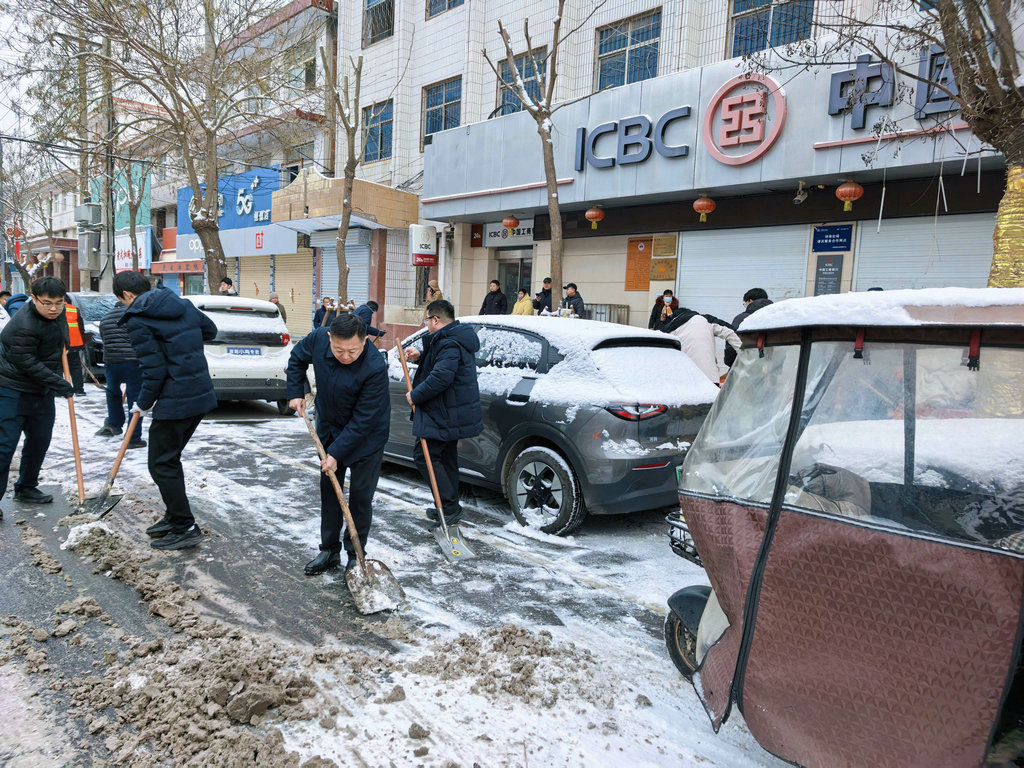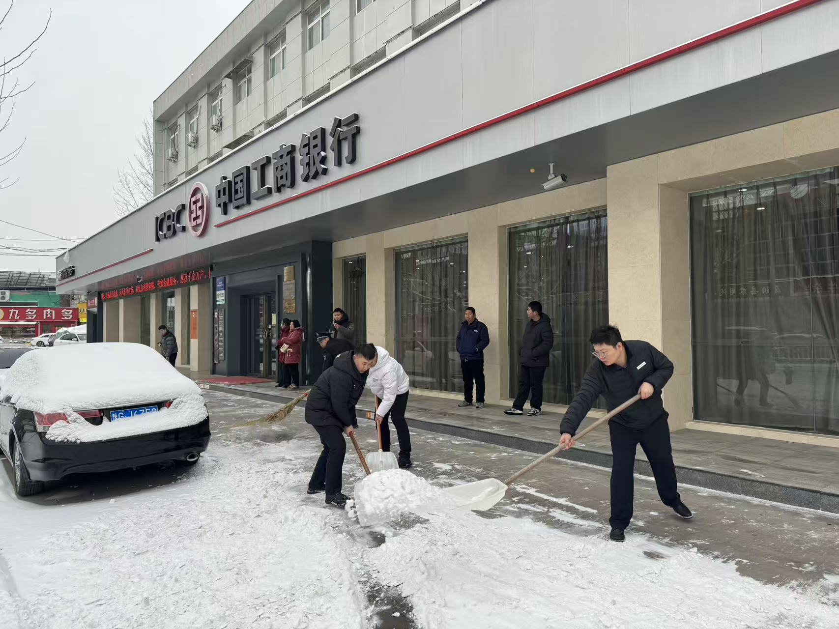 今日清晨,该行本部、辖内各网点的干部员工们积极响应,不畏严寒,提前到岗,大家拿起铁锹、扫帚等工具,迅速投入到扫雪工作中。他们分工明确,配合默契,有的奋力铲除台阶上坚硬的冰层,有的仔细清扫人行道上的积雪,有的在湿滑区域铺设防滑垫、设立临时警示标识..热火朝天的劳动场面,形成了冬日里一道温暖而独特的风景线。铲雪过程中,大家重点关注了网点门口、自助服务区、无障碍通道及周边人行道等关键区域。虽然寒风凛冽,但员工们的热情丝毫不减,手冻红了,搓一搓继续干,经过一个多小时的集中奋战,网点门前及周边主要通道的积雪和暗冰被清理得干干净净,一条条“平安路”“温暖路”在大家的共同努力下得以畅通。“没想到银行不仅服务好,还这么贴心,这下我们来办业务可放心多了!”路过的市民看到干净的路面,由衷地称赞道。