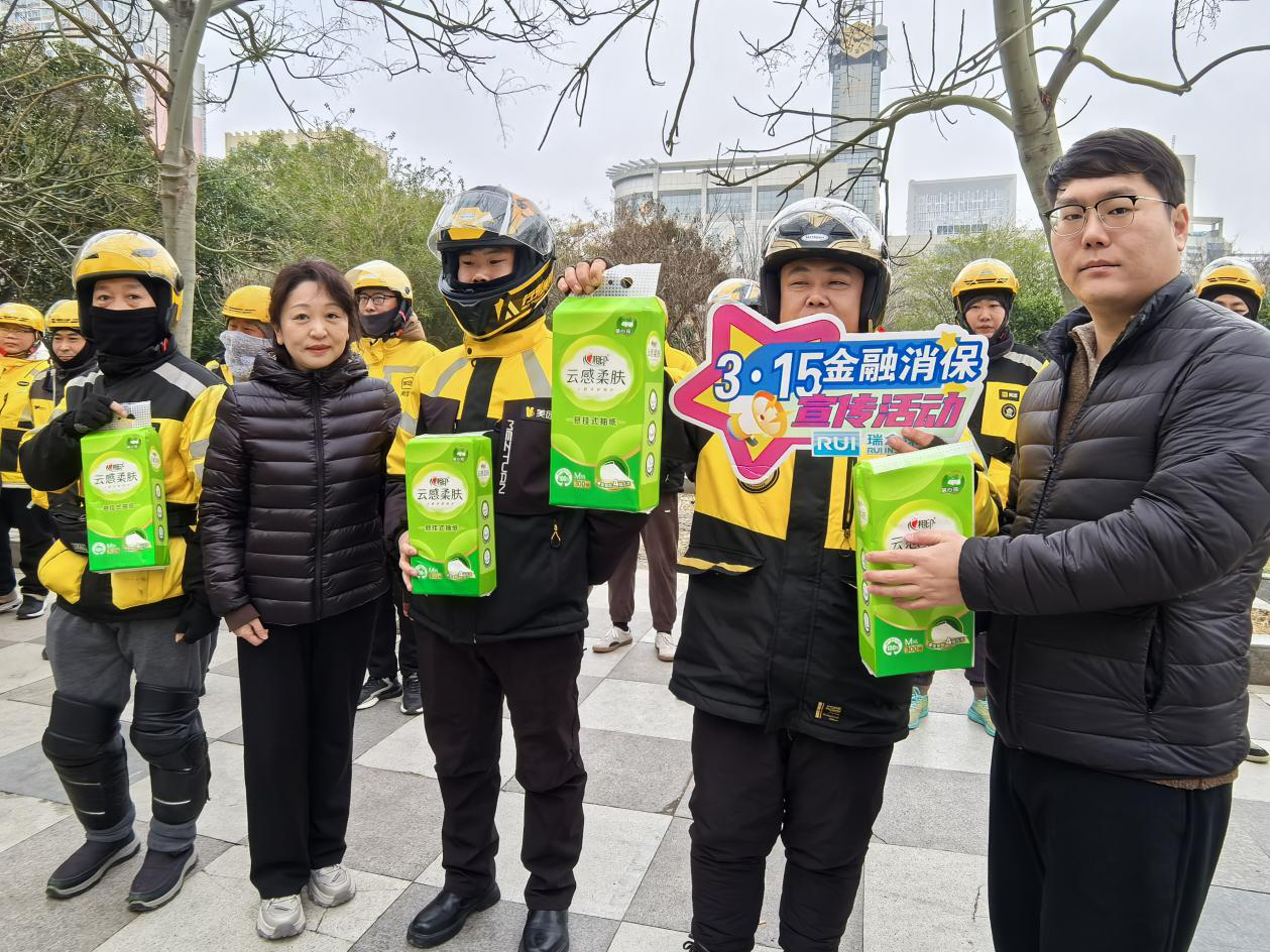工作人员现场为每位骑手送上实用纸抽,将为民办实事落到细微处,贴心的物资,让骑手们在学到实用消保知识的同时,真切感受到金融行业的关怀与温暖。
