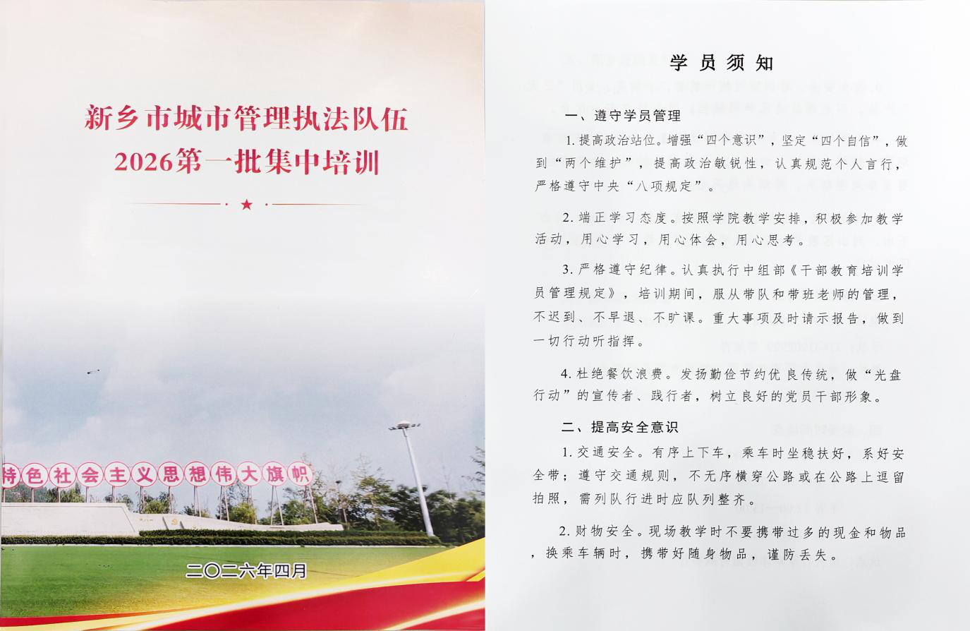 培训报到签到时,每名学员都会收到一份《培训须知》及课程安排表,《培训须知》将“严格落实中央八项规定精神”“严格执行培训期间禁酒规定”“严格执行请销假制度”“严格教育培训学员管理规定”等纪律要求转化为白纸黑字的庄严承诺。“这不是一份普通的纸张,而是一份沉甸甸的责任和担当。”新乡市城管局城市管理保障中心副科长姚瑶说。