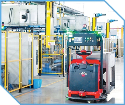 株硬集团粉末事业部的智能生产线上,自动导引车在进行无人化物料转运。 |