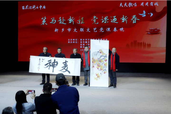 新乡网讯(新乡日报全媒体记者 李超 文/图) 2月10日晚,市文联主办的“策马赴新程 党课迎新春”文艺党课春节汇演在新乡演艺公司新梨园剧场举行。我市各行业先进模范代表、德艺双馨艺术家代表与群众代表欢聚一堂,在艺术熏陶中感悟初心使命,凝聚奋进力量。