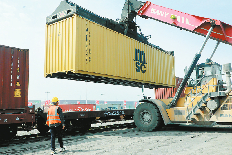 图为工作人员正在向班列上装载集装箱。李青春 摄