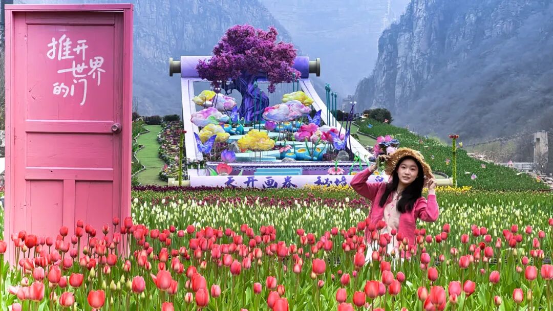 同样位于太行深处的宝泉旅游区,作为新乡赏花经济的“常青树”,已连续举办多届举办宝泉郁金香踏青赏花节,但每年都有新惊喜——今年布展200万株郁金香,种植图案、色彩搭配、装置艺术全部焕新升级。花海之上,巨型白熊花车巡游、小丑互动、水上独竹漂非遗表演等演艺活动轮番登场,让缤纷花海化作沉浸式互动舞台。