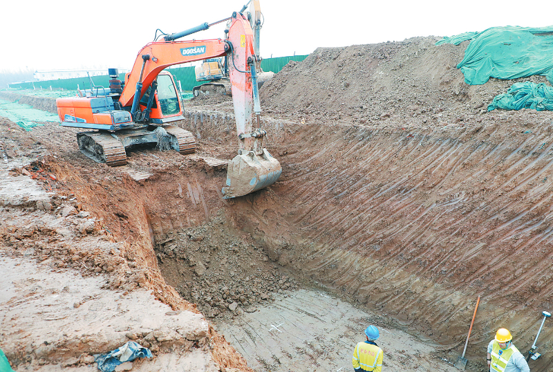 目前,市和平大道南延新建工程正紧张施工。其中,南环路至午阳路段长1500米,已建成并开放交通。午阳路至东孟姜女河桥段长1300米,计划今年8月底完成施工内容。图为进行地下管网施工。