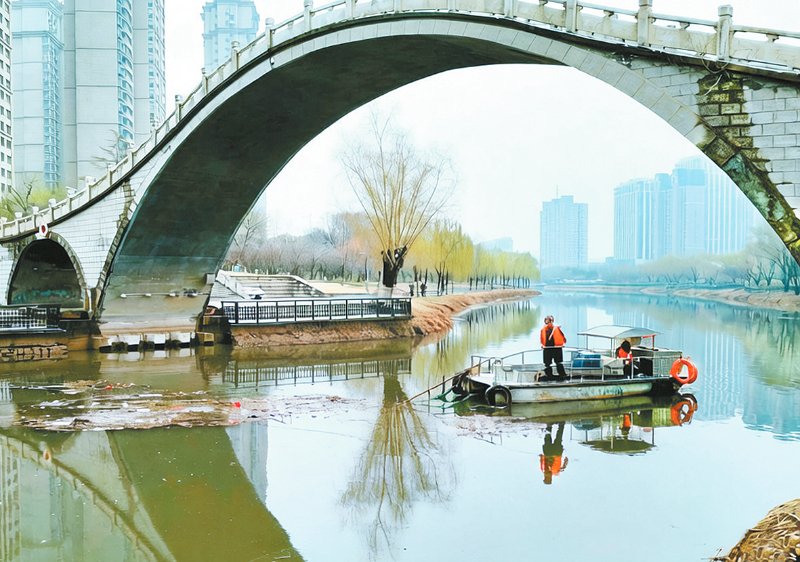 3月2日,河道保洁人员驾驶打捞船,在牧野文化广场北侧的大桥下的河面上打捞垃圾。他们仔细清理着杂物,守护着城市水生态的清澈,维护水环境质量,勾勒出城市治理与生态保护相融共生的和谐画面。 李青春 摄