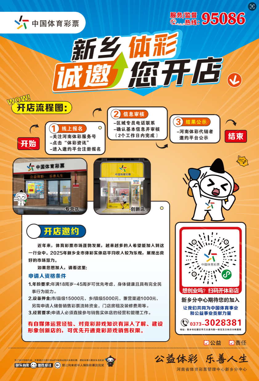 为进一步拓展彩票销售市场,提升购彩便捷度,推动体育彩票公益事业高质量发展,河南省体育彩票管理中心新乡分中心现面向全市公开征召体育彩票实体店代销者。报名流程简单便捷,申请人可关注“河南体彩服务号”微信服务号,点击“体彩资讯”进入河南体彩代销者邀约平台注册报名;也可拨打线下咨询电话 0373 - 3028381,或前往新乡市华兰大道 555 号体彩中心咨询。线上提交申请后,工作人员将对上报信息和经营场所进行核验,审核通过后办理相关手续。