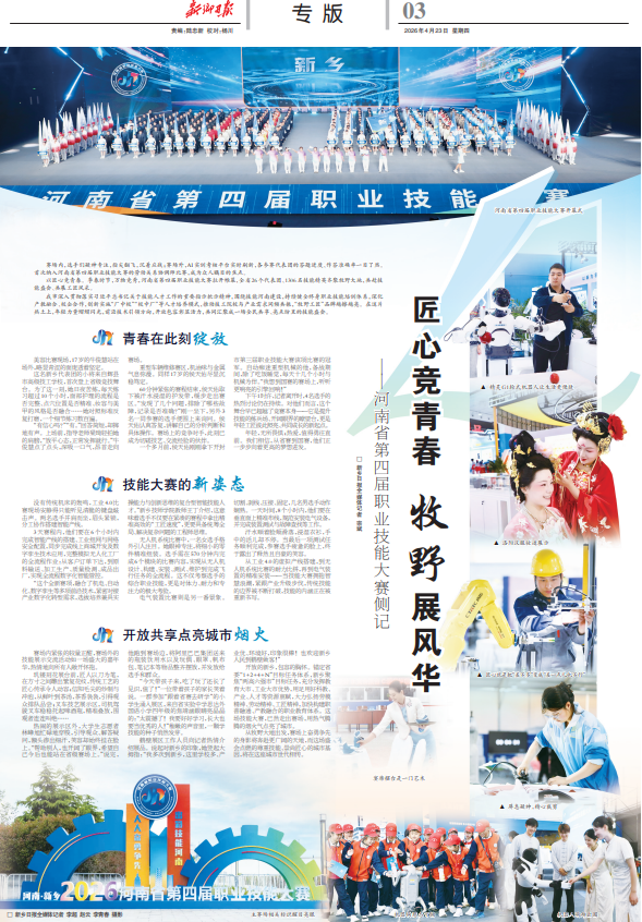 我市深入贯彻落实习近平总书记关于技能人才工作的重要指示批示精神,围绕技能河南建设,持续健全终身职业技能培训体系,深化产教融合、校企合作,创新实施“厂中校”“校中厂”等人才培养模式,推动技工院校与产业需求同频共振,“牧野工匠”品牌越擦越亮。在这片热土上,年轻力量熠熠闪光,前沿技术引领方向,开放包容彰显活力,共同汇聚成一场全民共享、亮点纷呈的技能盛会。